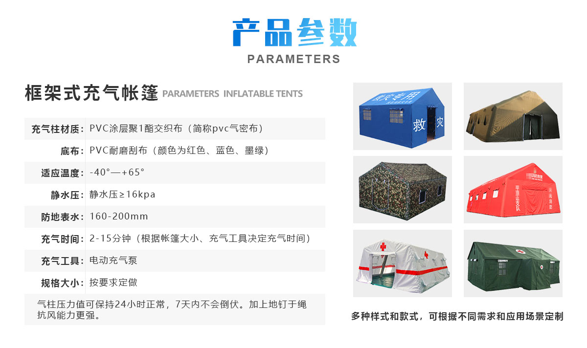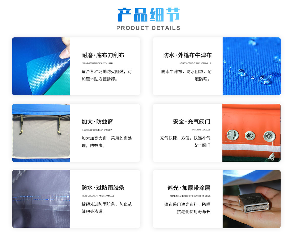 框架式羞羞APP大全充气帐篷:充气前,体积小便于携带、不需搭建充气3~5min即可成型,达到使用功能,外型阻风面小,抗风优于钢管结构帐篷。帐篷气囊是采用高强高分子复合气密布 采用高频专用模具热合成型。