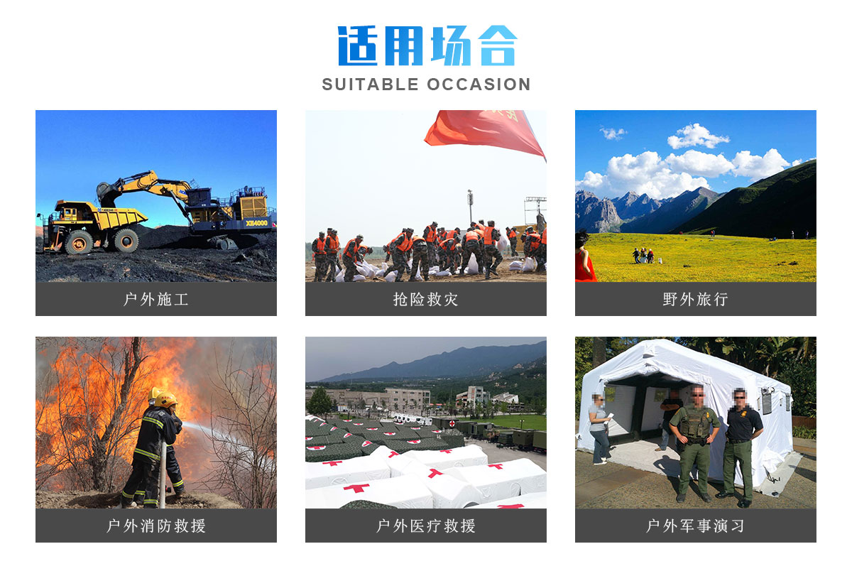 主要用于军队、工业、医疗、民用一般用途训练救灾、休闲。